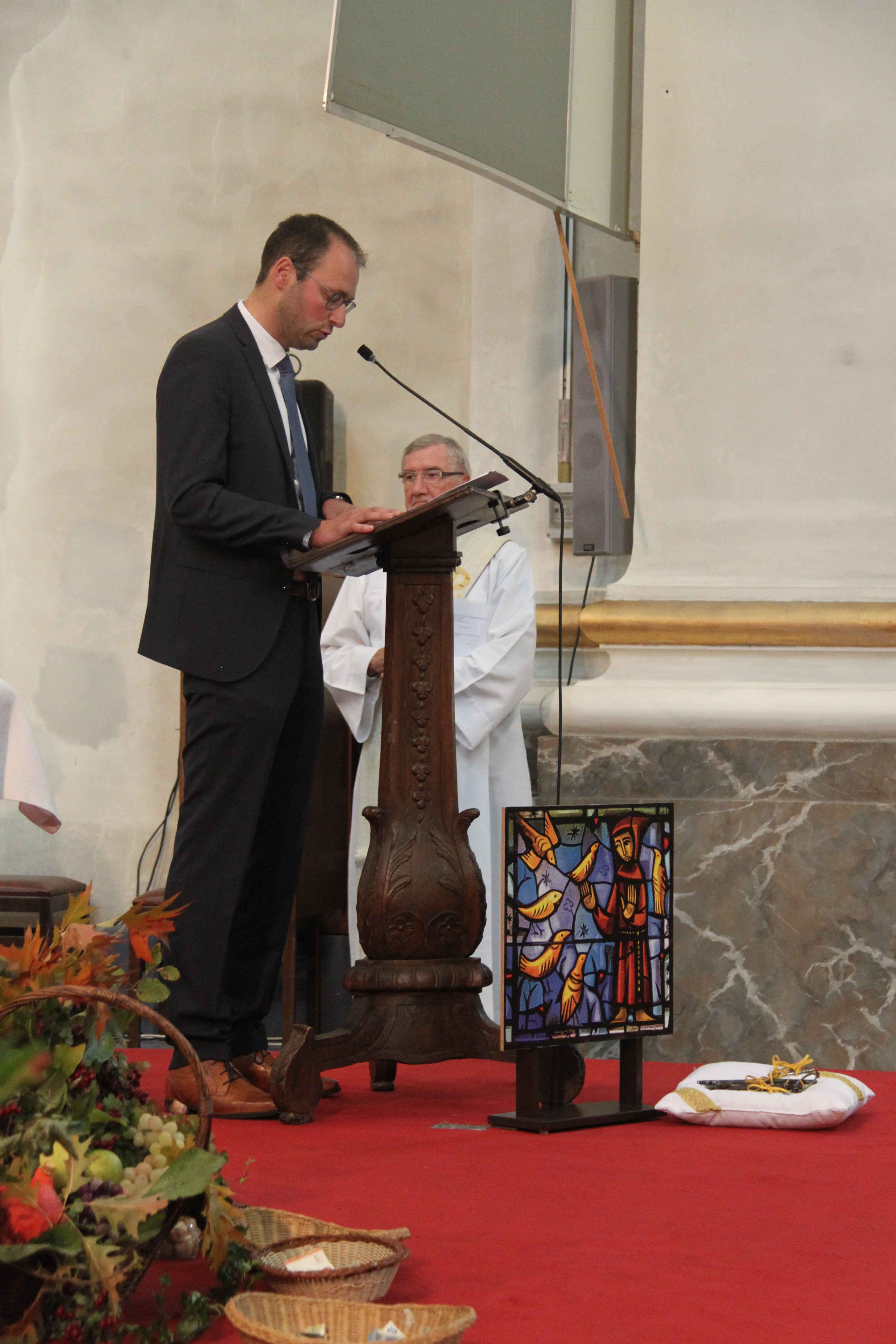 Pour une commune, un nouveau doyen est également un événement. Les contacts entre les autorités civiles et religieuses sont nombreux. Te Deum pour la fête nationale, le 21 juillet, pour la fête du Roi le 15 novembre, office religieux du 11 novembre, messe de commémoration pour les victimes des bombardements de Noel 44 mais aussi rencontre au sein des différents comités des Fabriques d’églises de la commune ou via les relations avec les œuvres paroissiales. Récemment nous avons pu finaliser la transaction du rachat de la salle de la Fraternité mais aussi quand l’asbl Tournesol qui vient en aide aux femmes victimes de violences conjugales, c’est dans un bâtiment des œuvres paroissiales qu’ils prennent place. Enfin entre les équipes au presbytère et celles de l’hôtel de ville, ce sont d’abord des relations de bon voisinage puisque seul un mur mitoyen sépare les deux bâtiments. Alors Monsieur le Doyen, cher Vital, cher voisin, bienvenue.